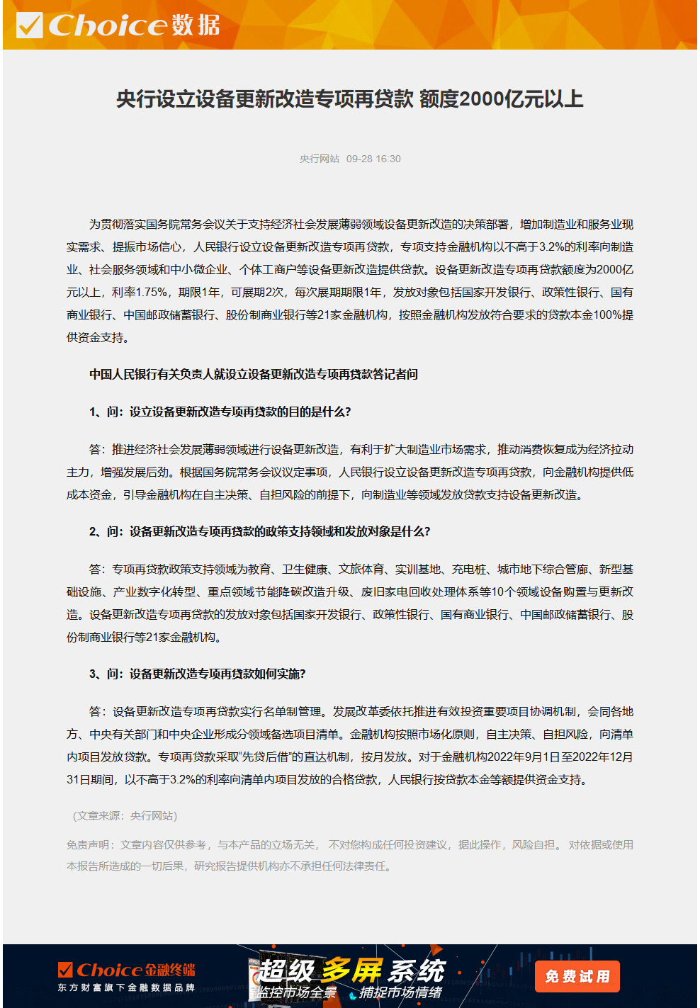 9月28日,根據(jù)中國人民銀行網站信息,為貫徹落實國務院常務會議關于支持經濟社會發(fā)展薄弱領域設備更新改造的決策部署,增加制造業(yè)和服務業(yè)現(xiàn)實需求、提振市場信心,人民銀行設立設備更新改造專項再貸款,專項支持金融機構以不高于3.2%的利率向制造業(yè)、社會服務領域和中小微企業(yè)、個體工商戶等設備更新改造提供貸款。設備更新改造專項再貸款額度為2000億元以上,利率1.75%,期限1年,可展期2次,每次展期期限1年,發(fā)放對象包括國家開發(fā)銀行、政策性銀行、國有商業(yè)銀行、中國郵政儲蓄銀行、股份制商業(yè)銀行等21家金融機構,按照金融機構發(fā)放符合要求的貸款本金100%提供資金支持。
