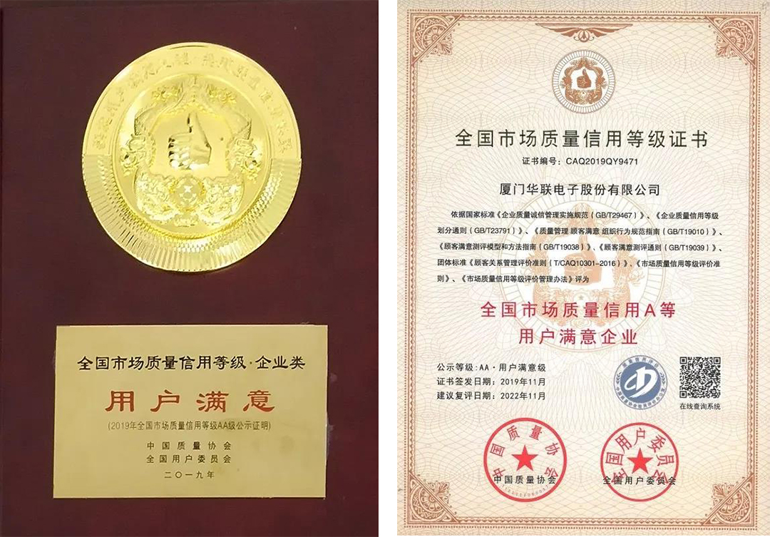 近日,中國質(zhì)量協(xié)會、全國用戶委員會在珠海聯(lián)合舉辦“2019滿意中國年會”,會上發(fā)布2019年全國市場質(zhì)量信用A等用戶滿意企業(yè)名單。名單依據(jù)《企業(yè)質(zhì)量誠信管理實施規(guī)范(GB/T29467)》、《企業(yè)質(zhì)量信用等級劃分通則(GB/T23791)》等多項國家標準選評,廈門華聯(lián)電子股份有限公司成功入選,公示等級為AA級。這已是華聯(lián)電子第四次獲得本項殊榮。