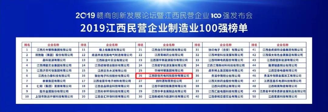 會上發(fā)布了2019江西民營企業(yè)100強(qiáng)、2019江西民營企業(yè)制造業(yè)100強(qiáng)名單,聯(lián)創(chuàng)光電均上榜,分別位列江西民營企業(yè)100強(qiáng)第49位、江西民營企業(yè)制造業(yè)100強(qiáng)第26位。聯(lián)創(chuàng)光電常務(wù)副總裁葉建青代表公司參會并領(lǐng)取獎牌。