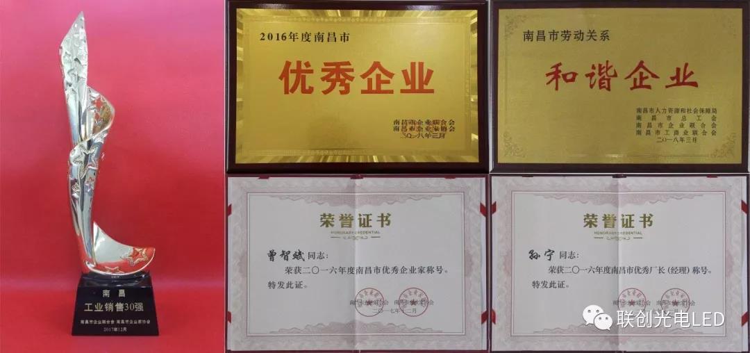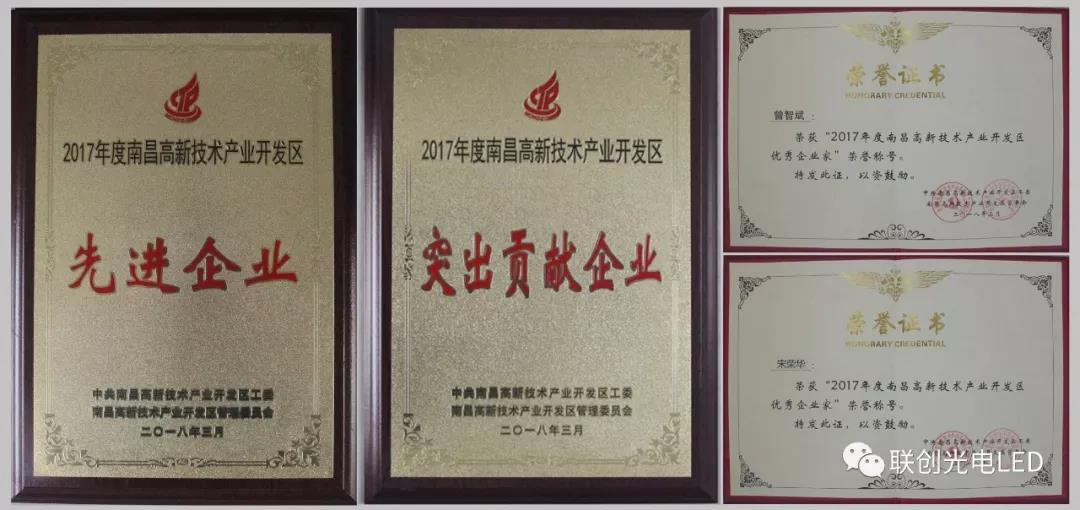 南昌高新區(qū)召開2018年經(jīng)濟(jì)工作暨科技創(chuàng)新大會(huì),聯(lián)創(chuàng)光電被授予“2017年度南昌高新區(qū)先進(jìn)企業(yè)”、“2017年度南昌高新區(qū)突出貢獻(xiàn)企業(yè)”榮譽(yù)稱號(hào),股份公司董事長曾智斌、總裁助理宋榮華分別榮獲“2017年度南昌高新區(qū)優(yōu)秀企業(yè)家”稱號(hào)。