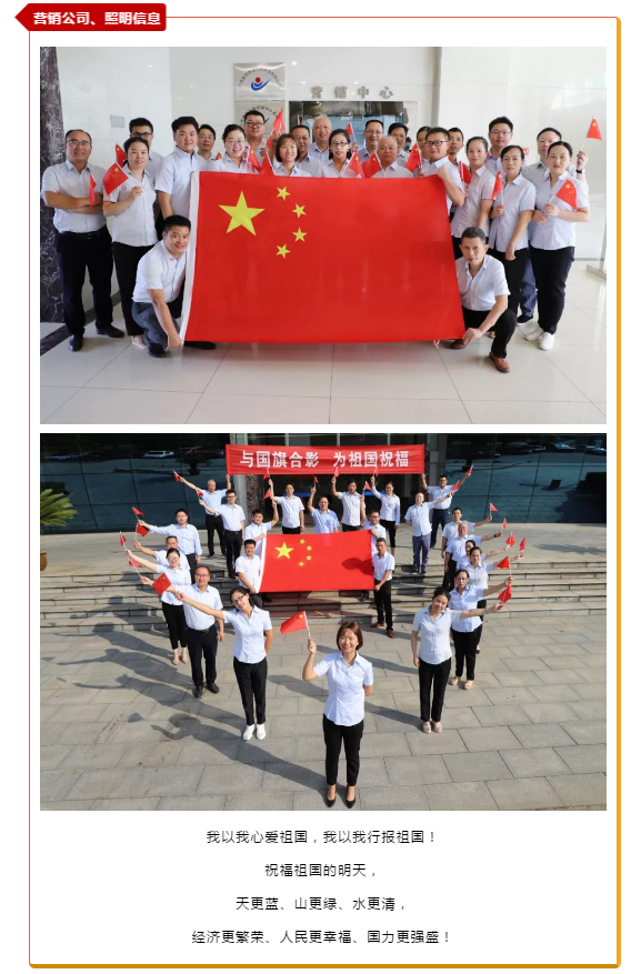 為慶祝中華人民共和國成立70周年,集團(tuán)下屬各經(jīng)營單位紛紛開展了“與國旗合影 為祖國祝?!敝黝}活動(dòng)。每一個(gè)鏡頭都傳遞一種聲音,每一面國旗都代表一顆中國心。下面,我們曬出每一張與國旗的合影,秀出我們對(duì)偉大祖國最真摯的熱愛和祝福!