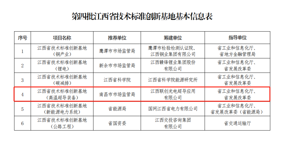 近日,省市場(chǎng)監(jiān)管局印發(fā)《關(guān)于同意籌建第四批江西省技術(shù)標(biāo)準(zhǔn)創(chuàng)新基地的通知》,同意江西聯(lián)創(chuàng)光電超導(dǎo)應(yīng)用有限公司牽頭籌建江西省技術(shù)標(biāo)準(zhǔn)創(chuàng)新基地(高溫超導(dǎo)裝備),這是我市獲批籌建的第2個(gè)省級(jí)技術(shù)標(biāo)準(zhǔn)創(chuàng)新基地項(xiàng)目。