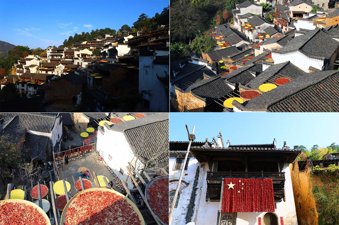 每當(dāng)日出山頭,晨曦初照,整個(gè)山間村落間,那飽經(jīng)滄桑的徽式民宿的土磚外墻與長(zhǎng)長(zhǎng)木架上,圓圓的竹匾里五彩繽紛的豐收果實(shí)排列組合,繪就出“曬秋”農(nóng)俗景觀,甚是壯觀。