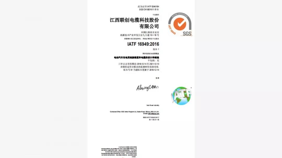 據(jù)了解,為開拓汽車行業(yè)市場,提升企業(yè)管理水平,聯(lián)創(chuàng)科技纜自2017年開始啟動IATF16949質(zhì)量管理體系的建設(shè)工作,并于2018年12月14日正式獲得SGS頒發(fā)的IATF16949:2016質(zhì)量管理體系認(rèn)證證書。認(rèn)證范圍為:電動汽車充電用連接裝置和電纜的設(shè)計(jì)和制造。